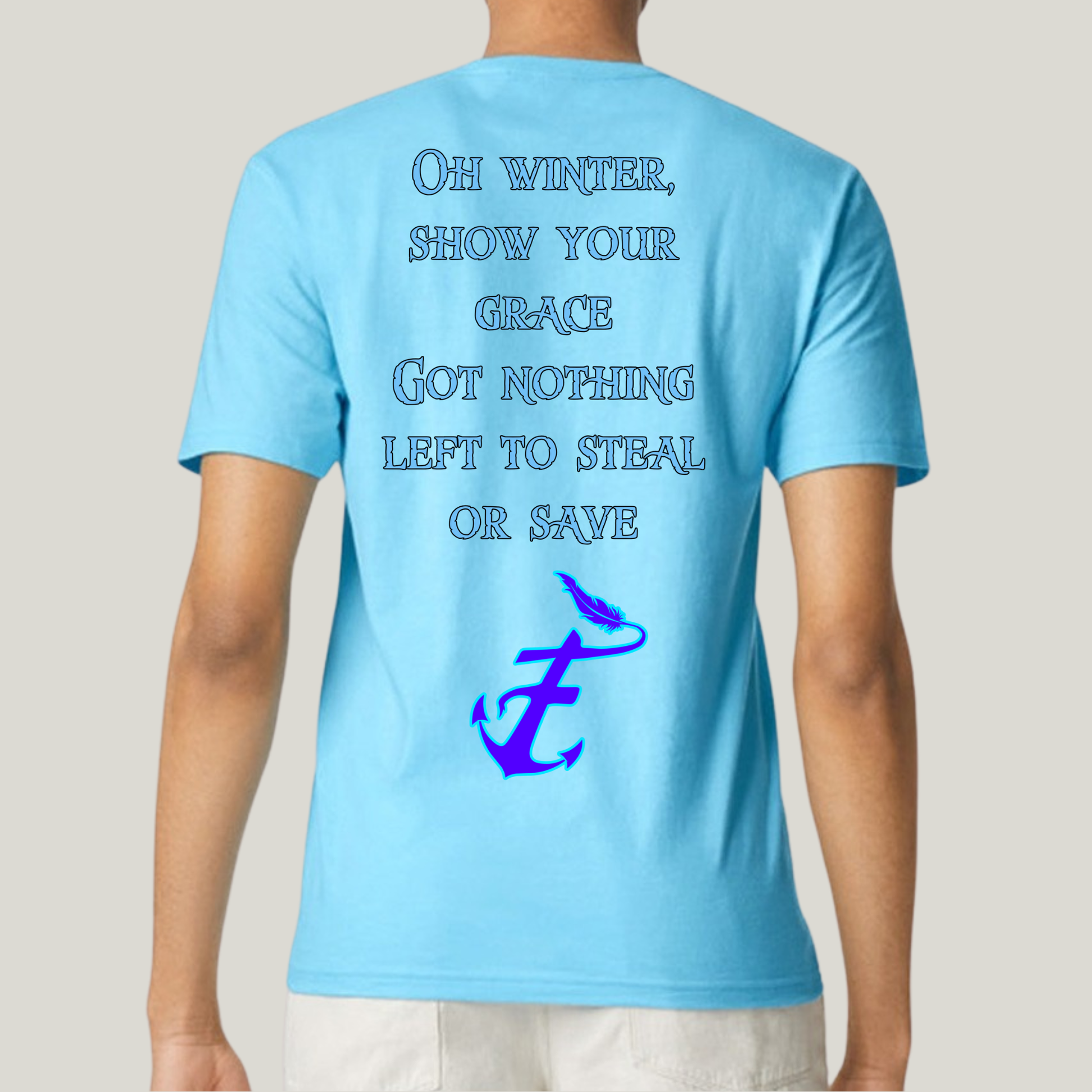Let the cold speak through you. Inspired by Featherweight’s song “The Frost Spoke Like God,” this shirt embodies the calm intensity and emotional weight of their sound. The front features a streak of vivid, frozen light cutting through the darkness—echoing the song’s blend of fragility and strength—while the back carries the haunting lyrics: